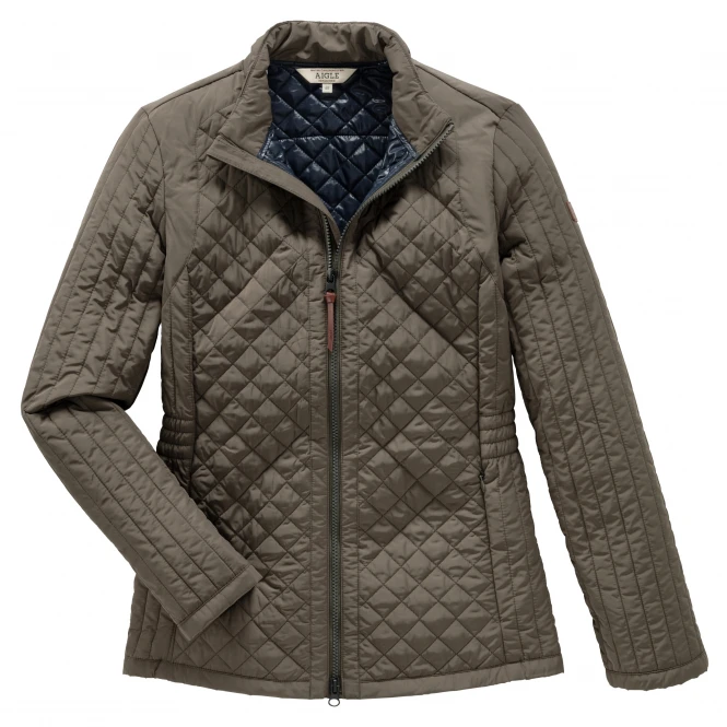 Made of light and water-repellent material with shiny ripstop lining. Jacket in waisted cut with diamond quilted front and back, side longitudinal pattern, waist with side elastic inserts, adjustable wrist width, inside pocket and 2-way front zip with chin protection. Colour: bronze. Upper and lining: 100% polyester. Contains non-textile parts of animal origin (leather zipper tag, logo leather badge).