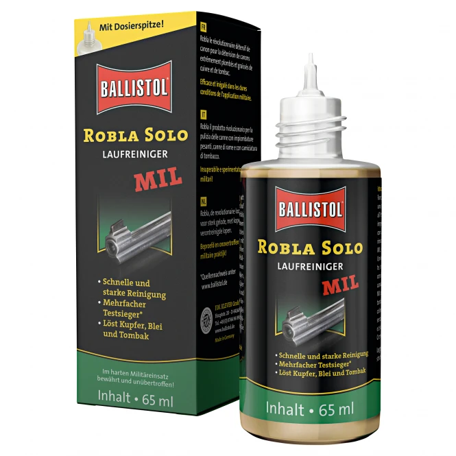 Proven even in tough military use and unmatched! Robla is containing ammonia, which not only gets rid of greasing of copper, zinc and Tombak, but also lead the enemy no. 1 for the precision of the weapon. Content: 65 ml.