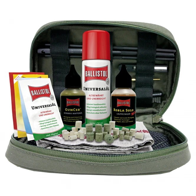 For fast, mobile weapon cleaning on the way. Equipment: Five-piece robust cleaning stick from approx. 18 to 90cm wipe length with accessories for caliber .22 (rifles) to 12 (shotguns), handle brush, test mirror, cleaning felt adapter, different weapon cleaning felts, weapon care cloth, universal oil spray 50ml, CunCer ceramic weapon oil 30ml, Robla Solo MIL 30 ml, 1 x Balistol stitch-free each, Animal and Neo-Ballistol household remedy.
