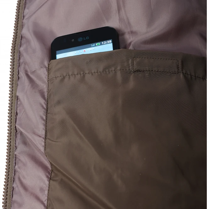 Elegant ladies quilted jacket in straight cut with microfiber trim on the shoulders and shoulder-chest area to the right. With two zipped pockets, high collar and buttoned cuffs that are trimmed with microfiber fabric. Hem in the back area is unbuttonable for more freedom of movement. Colour: dark olive / brown. Material: 100% polyester.