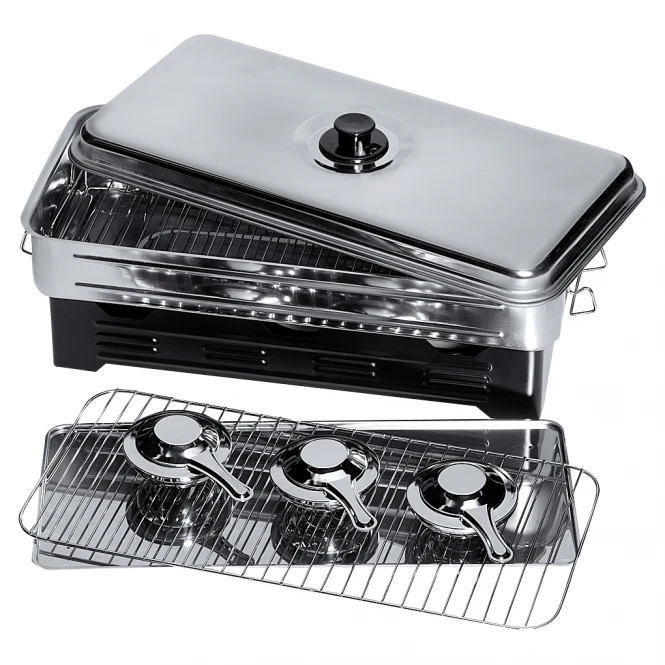 The heat is even and constant thanks to 3 burners. The lid is lockable. Outer dimensions: ca. 50 x 26 x 12cm. Inner dimensions: ca. 47 x 23 x 10cm.