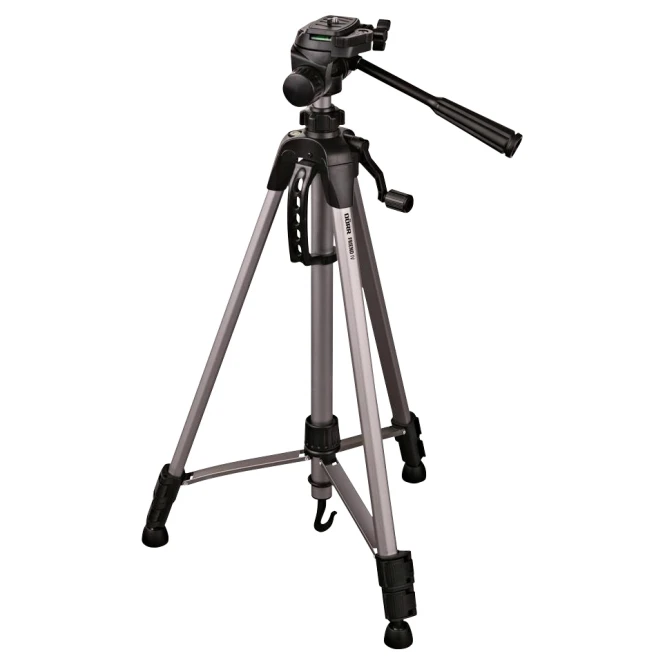 3 parts with 2 pull-outs and clamp fasteners. Centre column with crank and carrying handle. 3D Panhead with “¼” quick release plate and a hook for additional weight. With non-slip rubber feet and pocket. Length approx.: 57-151 cm. Weight: 1,03 kg.
