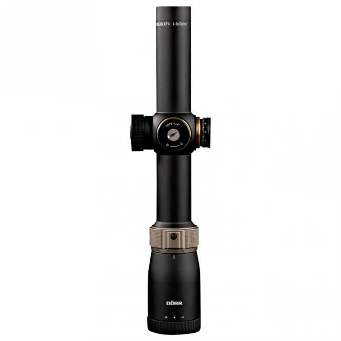 Powerful riflescope for use in twilight with 1 to 6x magnification and 24 mm objectives. Twilight number: 4.9 – 12, field of view at 1,000m: 39.8m – 6.8m, exit pupil Ø: 9.6 – 4.0mm, interpupil distance: 95mm, reticle: 4A red dot in 2nd image plane, Max. Travel height/side: 160 MOA, tube diameter: 30mm, length: 28.2cm, weight: 499g.