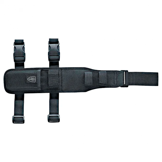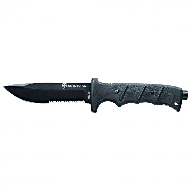 The Elite Force EF 703 Kit is a top-quality survival knife with many practical features and accessories. Its sturdy, matte black blade made of 440 stainless steel has a partial serration; the TPR-coated molded plastic handle is screwed to the full tang, creating an extremely rugged unit. The multifunctional sheath of the EF 703 Kit is attached with three belts to a nylon thigh pouch. It has a holder for a fire starter and integrated honing surface, both included.