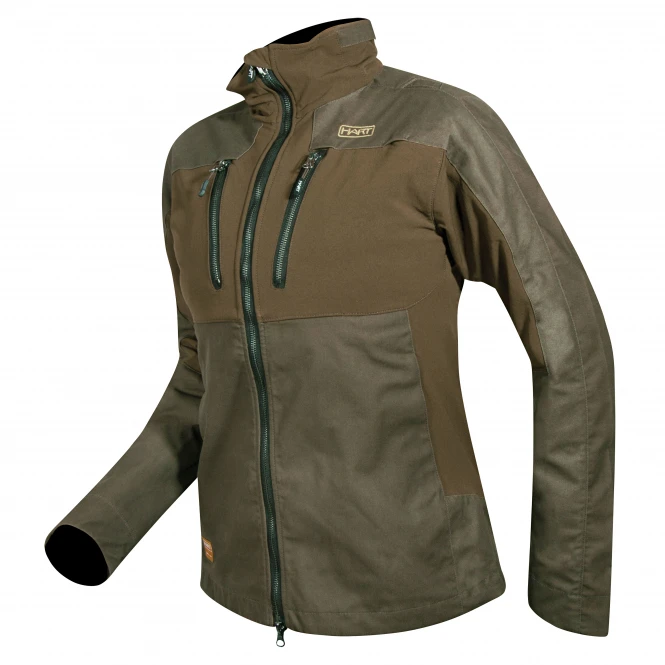 Light, sporty jacket for outdoor activities in different climatic conditions. Made of resistant canvas. Water-repellent because impregnated with wax. Elastic nylon inserts. With 2 front pockets with zip, 2 breast pockets with metal zip, pocket on the back with zip and adjustable collar. Colour: green. Upper material: 65% polyester, 35% cotton, inserts: 90% nylon, 10% elastane, lining: 100% polyester.