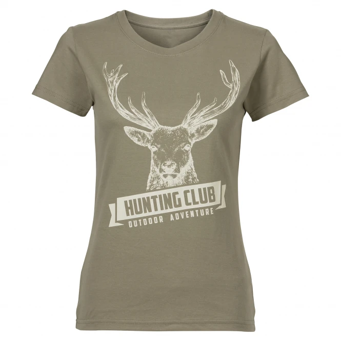 Ladies T-Shirt with deer print on the front and “Hunting Club” lettering. Colour: khaki. Material: 100% cotton.