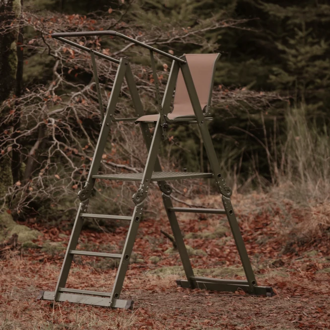 Flexible driven hunt seat that is easy to transport and quick to set up. With adjustable rifle rest for safe shooting. Ideal also for driven hunt or spontaneous use. Height: approx. 180 cm. Total weight: approx. 26.5 kg. Max. Load capacity: approx. 150 kg. Assembly time: approx. 5 – 10 minutes. Seat surface: 40 x 50 cm. Transport dimensions: approx. 118 x 95 x 30 cm. Colour: olive green. Material: aluminum frame and steel standing platform.