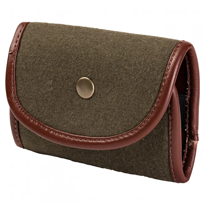 Noble, noiseless shell case made of a classic leather/ loden combination. 12 shells can be stored well protected with elastic bands. With stable leather attachment for belt fastening. Dimensions closed: 14 x 10 cm, opened: 14 x 28 cm.