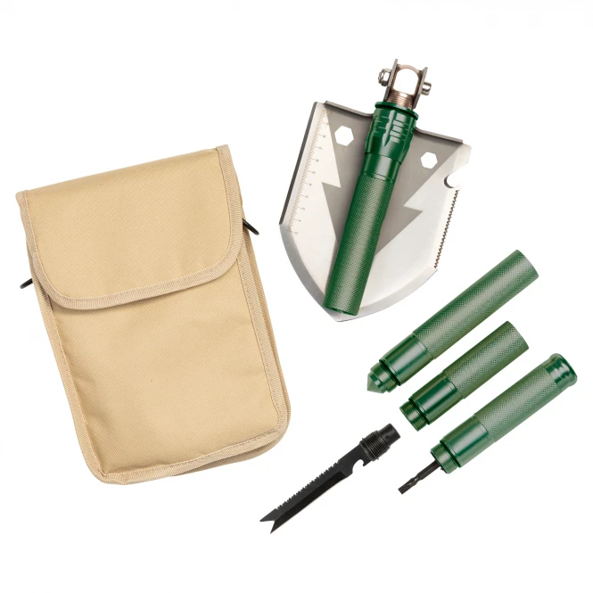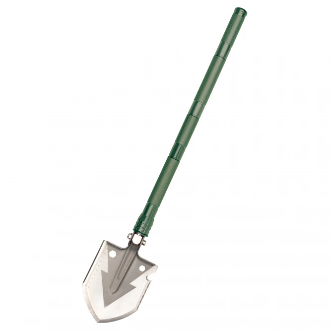 Folding spade/multitool tool in high-quality design with practical carrying bag. This tool has a stainless steel spade blade with additional knife/blade and saw function. There are hexagonal holes for loosening nuts and a 10 cm measuring tape for easy measuring procedures. The multi-compartment spade handle features a glass breaker, cross-slot screwdriver and compass. Total length: 74 cm. Transport size: 23 cm.