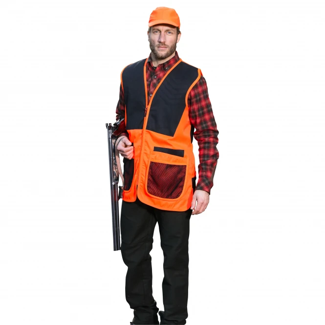 Classic shooting vest with spacious side pockets for ammunition and papers. A modern rabbit pocket and reinforced shoulder parts round off the positive overall impression. Colour: orange/black. Material: 100% polyester.
