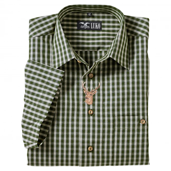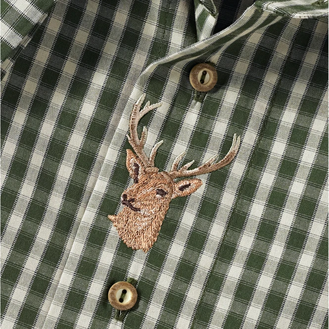Plaid short-sleeved shirt with hunting deer head embroidery and buttons made of deer horn imitation. With breast pocket. Colour: green/beige plaid. Material: 100% cotton.