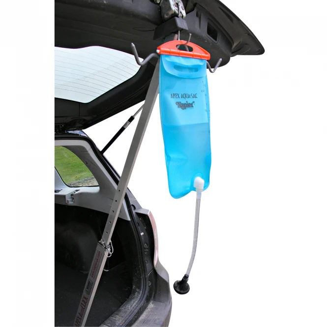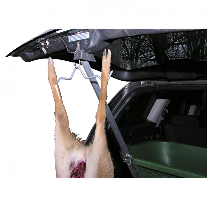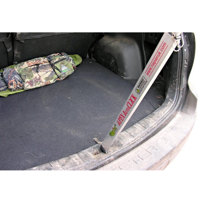 Patented auto carcass processing aid. Simply clicks in and out in less than 5 seconds. Fits most hatch gate vehicles including SUVs, hatchbacks and estates. Safely supports any game species up to 165 kg. No tools required. Allows full access to load area. 2 litre Aqua-Sac included. Compact for stowage. Pack includes: 1 Apex Auto Click, 1 Apex Gambrel, 1 Apex Aqua-Sac.
