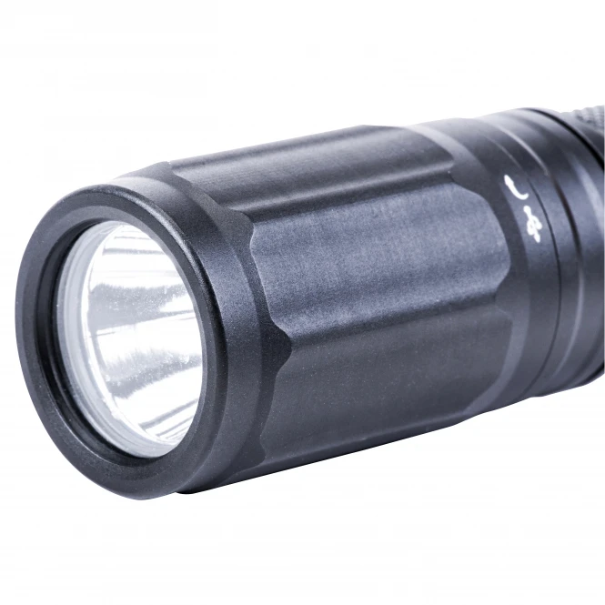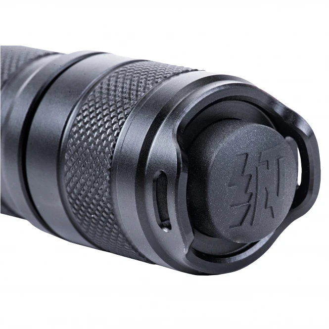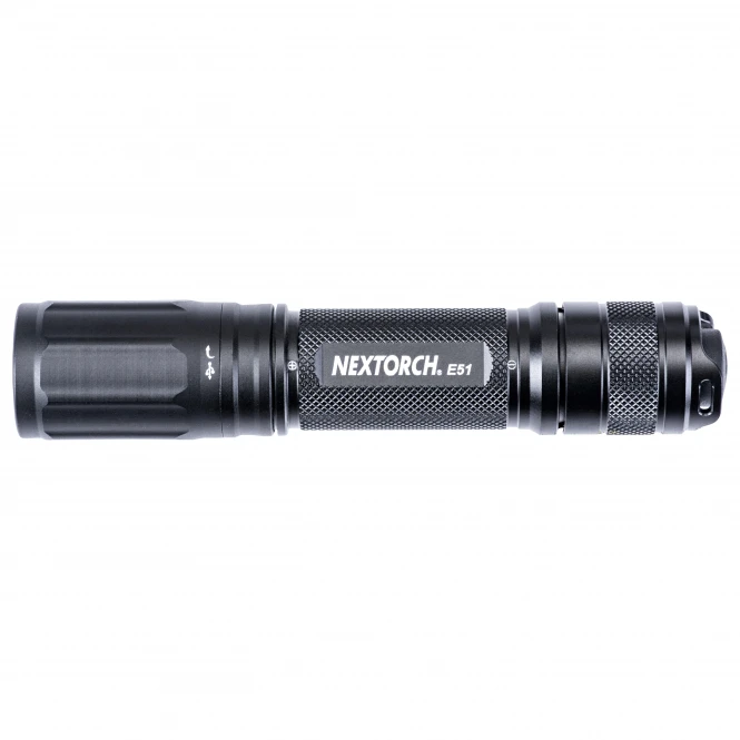 Rugged, waterproof LED flashlight. Light output up to 1400 lumens. Light range up to 201 m. Maximum run time is 48 h. Length: 13.3 cm. Weight: 84 g. USB battery and USB charging cable included.