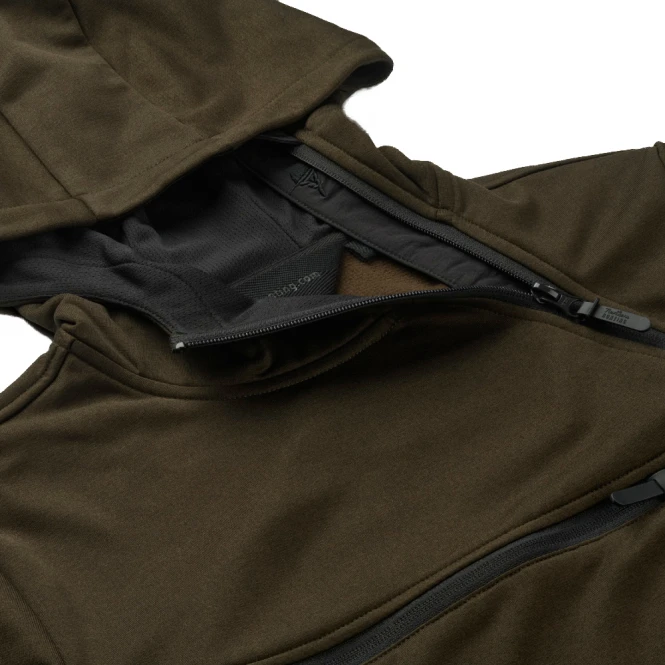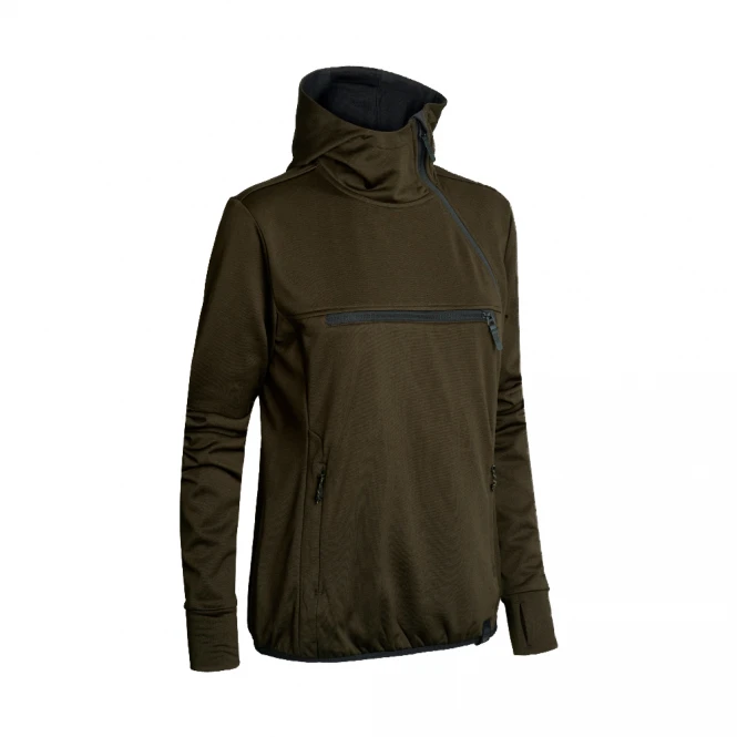 A beautiful and practical pullover for hunters and outdoor enthusiasts. The Saga fleece is ideal as a heat-insulating mid-layer under the shell jacket. Extremely quiet and flexible, which makes the fleece very comfortable. With large anorak pocket on the front and 2 hand pockets. The asymmetric zip creates an exciting look and increases ease of use. Colour: brown. Material: 96 % polyester, 5 % elastane. Contrast: 92 % polyester, 8 % elastane. Lining: 100 % polyester.