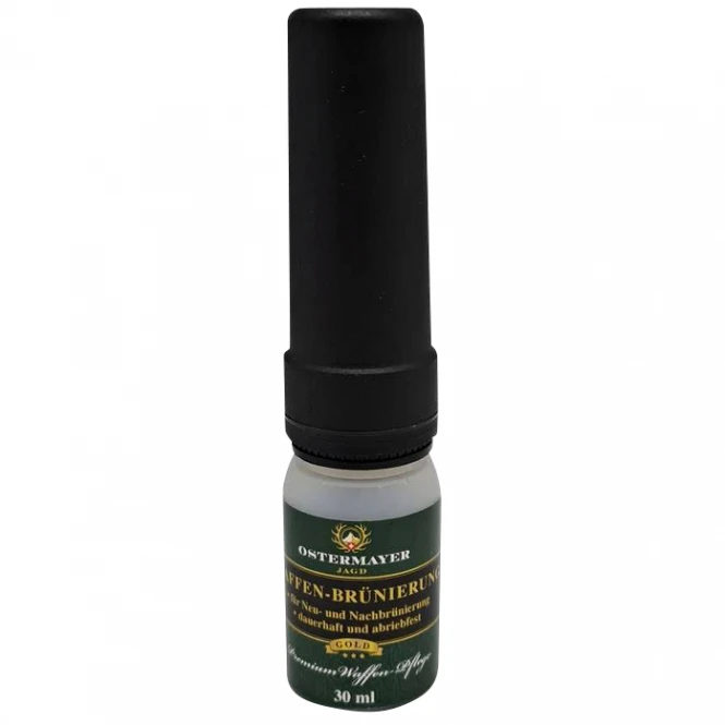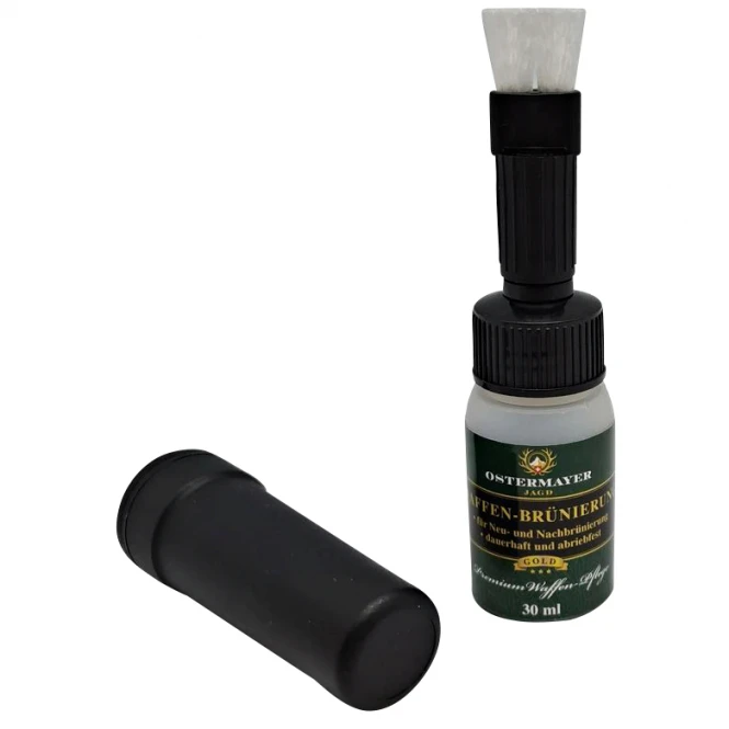 For best results, the parts should be well prepared, the base material should be even and completely free of grease. Even when touching up damaged bluing, we recommend thoroughly degreasing the parts with Ostermayer Hunting Gun Degreaser. Afterwards, the gun bluing can be applied with the help of the brush pen. After about 2-8 minutes the area is burnished. Then rinse the treated area with warm water and burnish again until the desired blackening is achieved. Then fix the blackening with Ostermayer Jagd blackening fixer and protect against corrosion – finished. For more shine, polish with the Ostermayer Hunting Polishing Cloth.