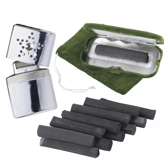 Super warmth for chilling days. A choice of pocket warmers, using either fuel sticks or lighter fluid. The set contains 1 lighter fluid pocket warmer, 1 fuel stick pocket warmer, and 1 packet of fuel sticks.
