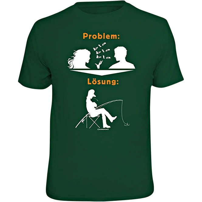 Comfortable, straight-cut short-sleeved shirt with a high round neckline. Ideal for a trip to the water, but also suitable for everyday life. The large print and the german lettering on the front clearly shows your love for the hobby in a humorous way: “Problem: Bla bla bla – solution…”. The material is comfortable to wear. Colour: green. Material: 100% cotton.