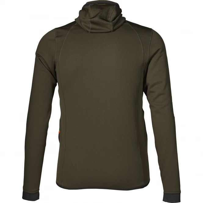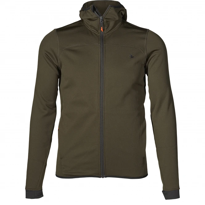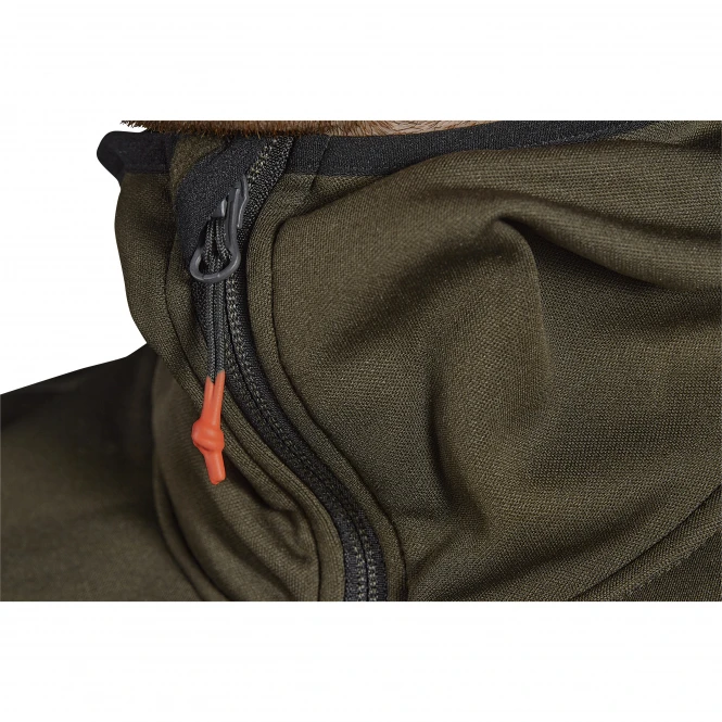 A fleece jacket with front pocket, full zip, fitted hood with elastic edge binding and elastic cuffs with thumb hole. Colour: pine green. Material: 100% polyester.