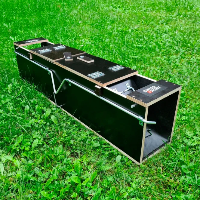 The SwissHunt Artemis 150 is an absolute professional live trap with footboard release, as it is also used by gamekeepers and pest controllers in continuous operation. Suitable for all domestic predators such as cats, foxes, badgers, martens and, thanks to the double safety device, also for raccoons, beavers and otters. Releases extremely finely due to lightweight aluminium linkage and perfectly balanced footboard, making it ideal for cautious martens. Made from 15mm screen printing board for extra long use and good weather protection. The trap stands on 15mm feet and is therefore protected from ground moisture. The catch can be easily viewed through the large viewing window without having to open the trap. Baiting is also done through an opening conveniently from above through another opening. The trap is very dark when closed because it is manufactured to fit exactly, so that the trapped animal usually behaves in a very relaxed manner.