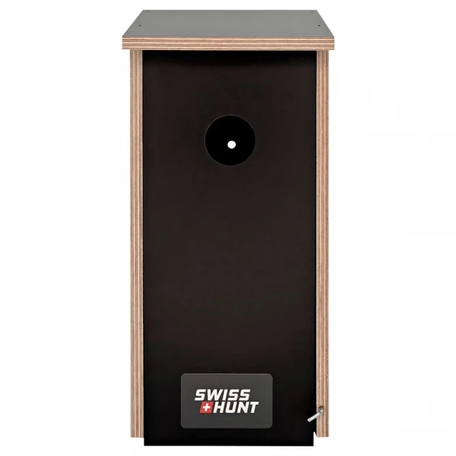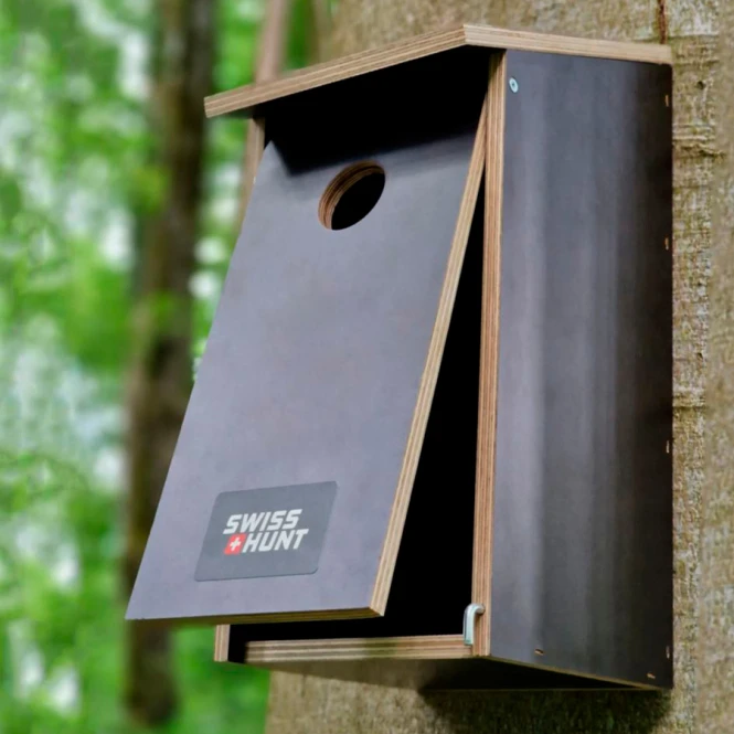 SwissHunt nest box for cavity nesting birds. Nesting box made of weather-resistant hardwood screen printing panels. The 35mm opening makes it particularly suitable for cavity-nesting birds such as sparrows, titmice, pied flycatchers and nuthatches. Easy to open/clean through front opening. Easy to fix with 2 screws. Dimensions: 14.5 x 18 x 31 cm. Weight: approx. 1.3 kg