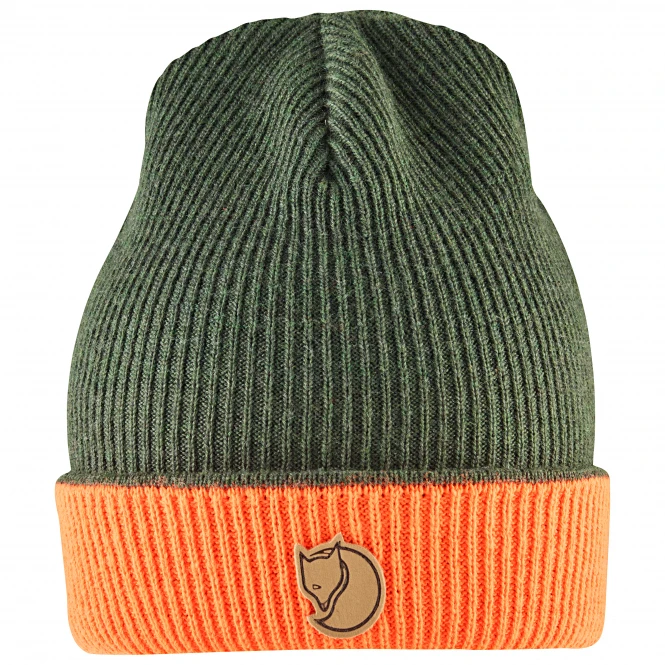 Two-sided knit Beanie made of soft merino wool blend, which absorbs a lot of air and maximizes insulation. Perfect in cold weather. A side with orange fold for better visibility. Knitted in Sweden. Colour: dark olive. Material: 50% wool, 50% acrylic